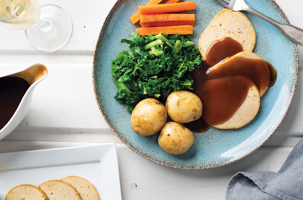 Constructed from tofu, this succulent vegan chicken-style roast is of course gluten-free and ideal for including protein to your Sunday dinner.