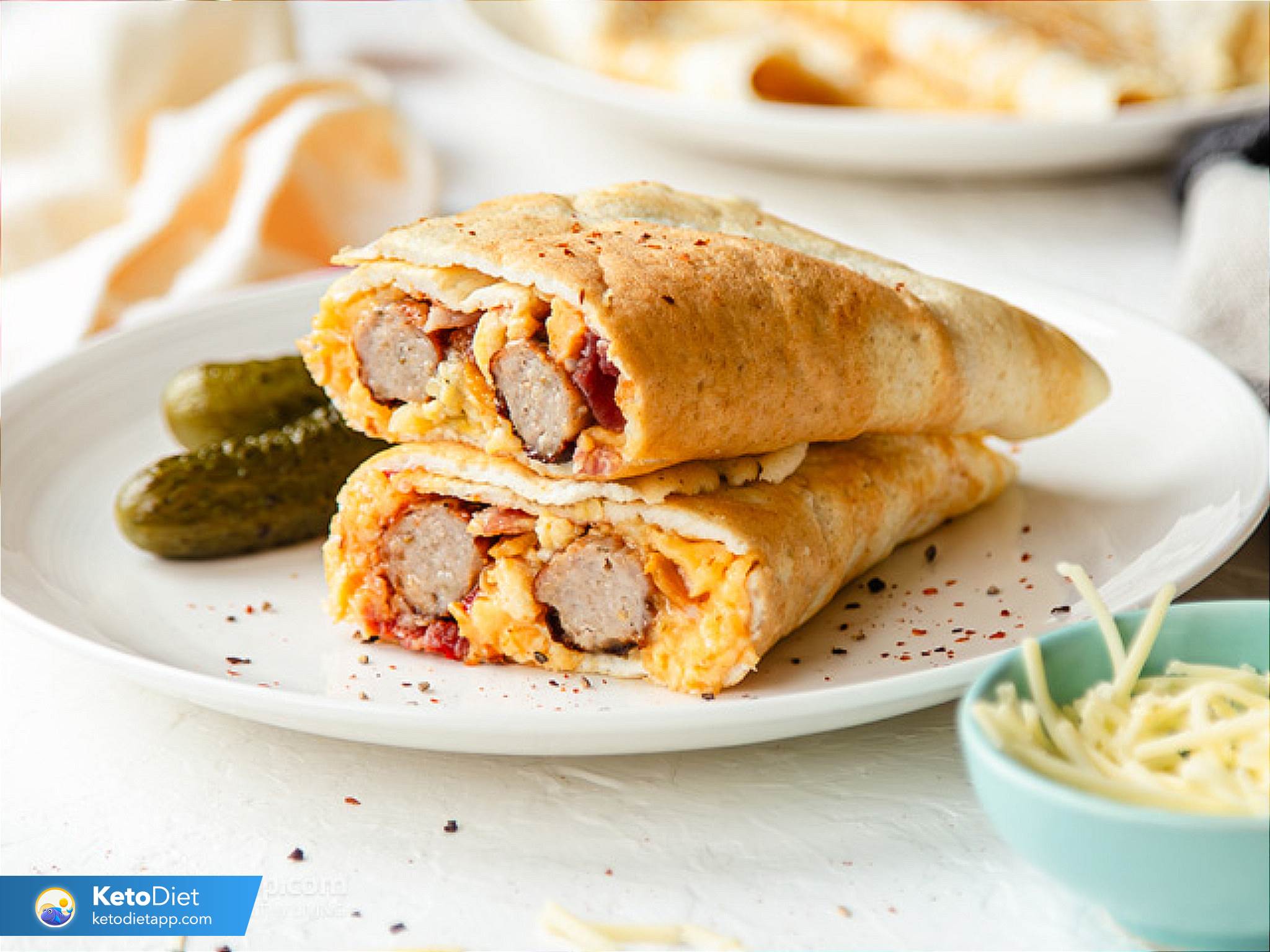 - Assemble & Serve: Lay a wrap flat. Unfold the tacky scrambled eggs horizontally throughout the middle. High with the sausages (lower lengthwise if utilizing massive ones) and crisp bacon. Drizzle with sriracha or sugar-free ketchup.