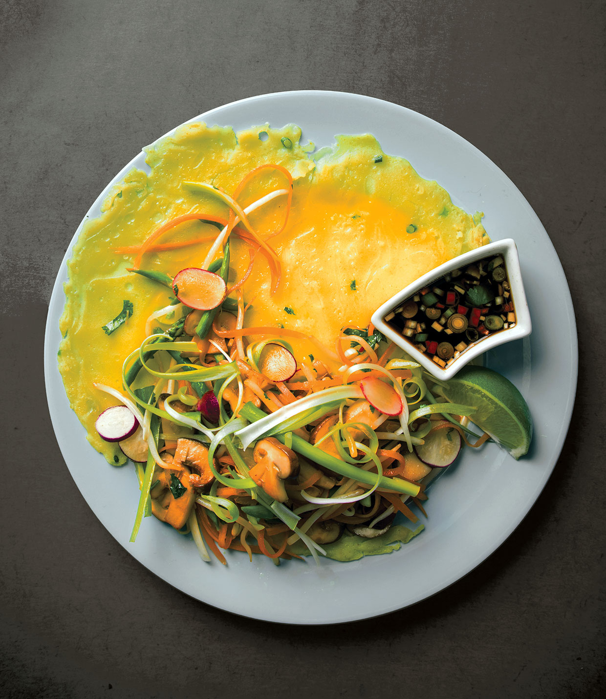 The normal Vietnamese recipe is of course vegan and gluten-free, utilizing rice flour and turmeric to create delicate, golden pancakes. Every pancake acts as a crisp shell for a hearty filling of stir-fried mushrooms, tender asparagus, and crunchy uncooked radishes and carrots.