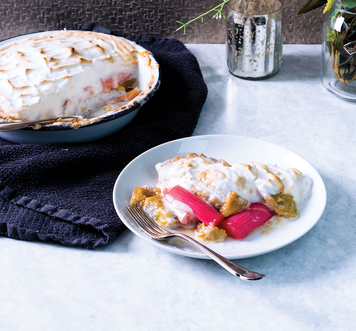 It swaps the standard mixture of custard, cake, and jam for tender, poached rhubarb with a vegan-friendly custard-thickened base. Topped with egg-free meringue, the result’s a lightweight, refreshing dessert that feels deeply indulgent.