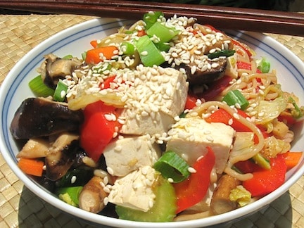 - Add the scallions, shiitakes, and cabbage. Prepare dinner one other 3 minutes, or till greens are tender. Add the tofu and gently combine within the noodles and all remaining sauce.