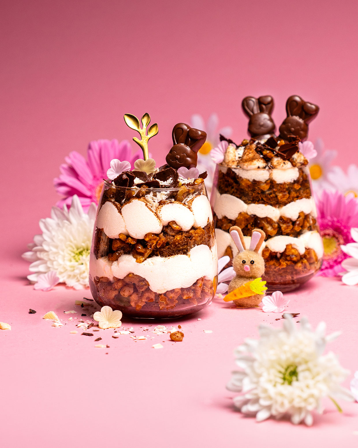A playful Easter twist on traditional tiramisu, these pleasant desserts are made with comfortable carrot cake layers, creamy vegan mascarpone, a spiced brown sugar syrup soak and a crunchy nut layer. For an indulgent end, that is all topped with cinnamon, chocolate shavings and lovable chocolate bunnies.