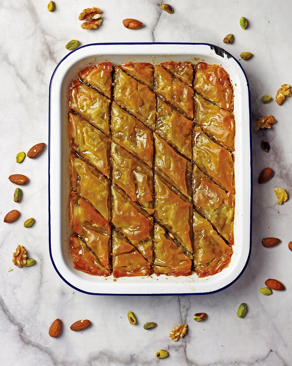 Pre-heat the oven to 170°C/340°F/Gasoline 3½, then reduce the baklava into 20 items, holding the items collectively within the dish, and place into the oven to bake for half-hour, till the pastry is golden and crisp.