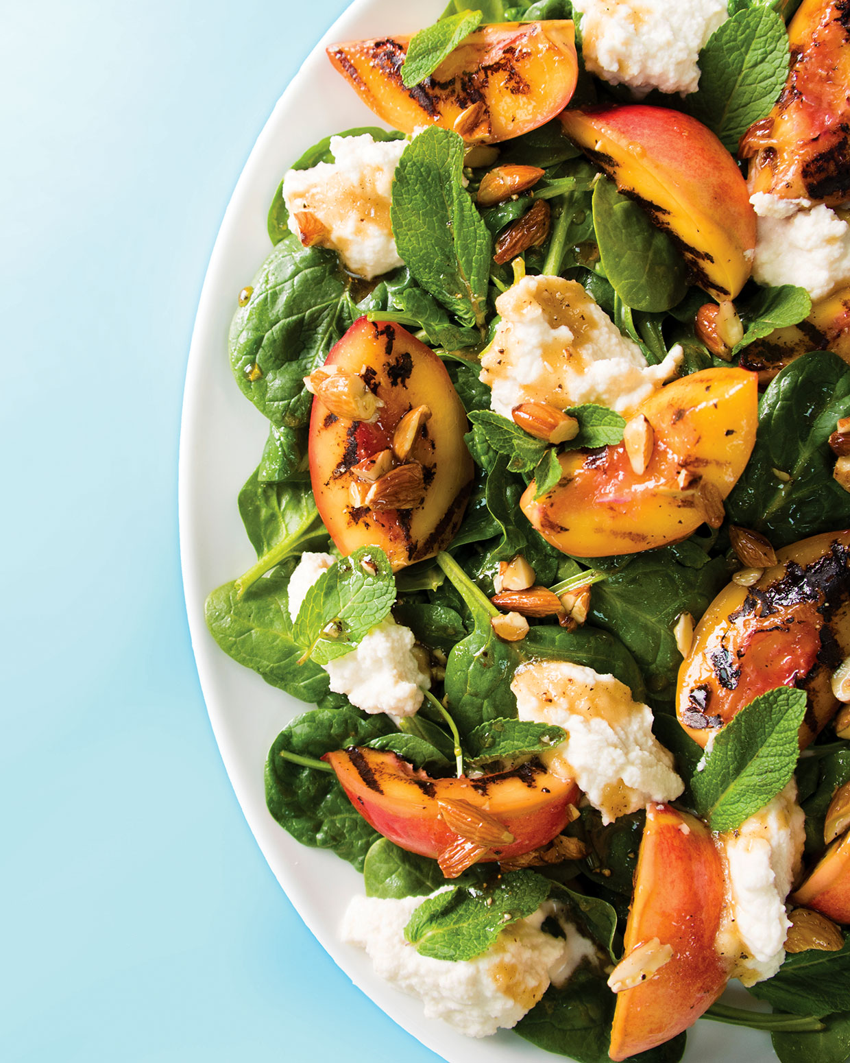 By searing contemporary nectarines on a scorching griddle (or barbecue), you intensify their pure sweetness whereas including a touch of smoky flavour that tastes scrumptious with the creamy vegan ricotta and contemporary child spinach. To convey all of it collectively, douse the salad within the heat maple and garlic dressing, which incorporates toasted, complete almonds for a satisfying crunch.